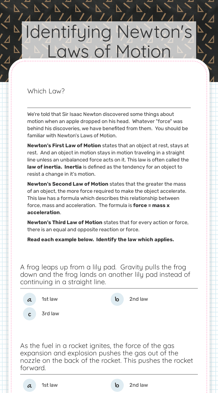 Applications Of Newton S Laws Of Motion In Sports Corestability Matter Science Science Teaching Resources Newtons Laws Of Motion from i.pinimg.com Isaac newton stated his ideas about inertia as a scientific law. Select the correct ailswer (a, b, or c) and justifu your answer. Momentum is inertia in motion. Newton's first law of motion is also called the law of inertia. The tendency of an object to resist a change in motion is inertia. Review what you have learned about newtons first law by working . You dribble a basketball while walking on a basketball court. ___ inertia is the property of matter that causes an object to move with ease.